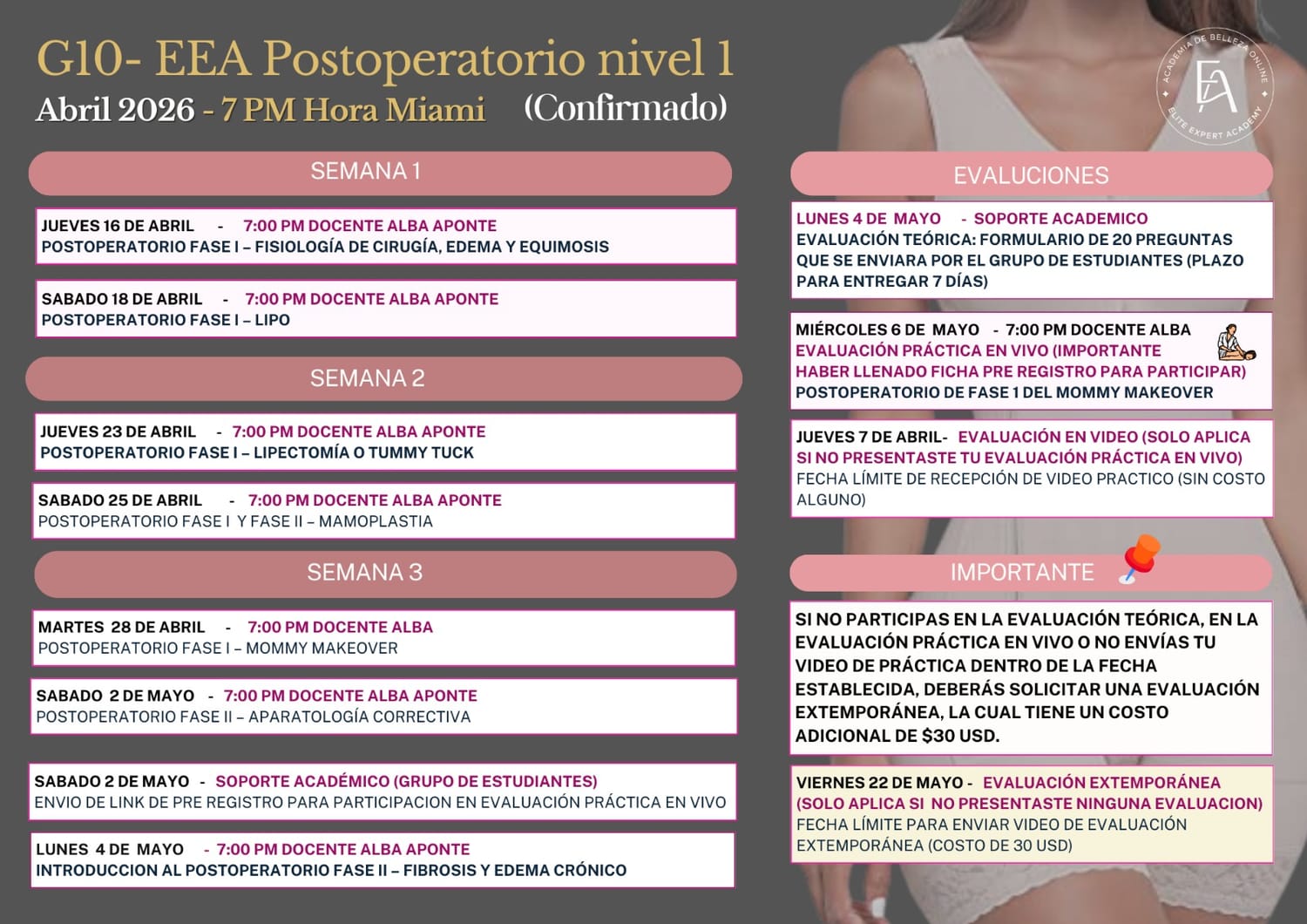 Regístrate para ver toda la información del seminario, conocer el cronograma completo y acceder a una formación de alto nivel en postoperatorio con clases en vivo.